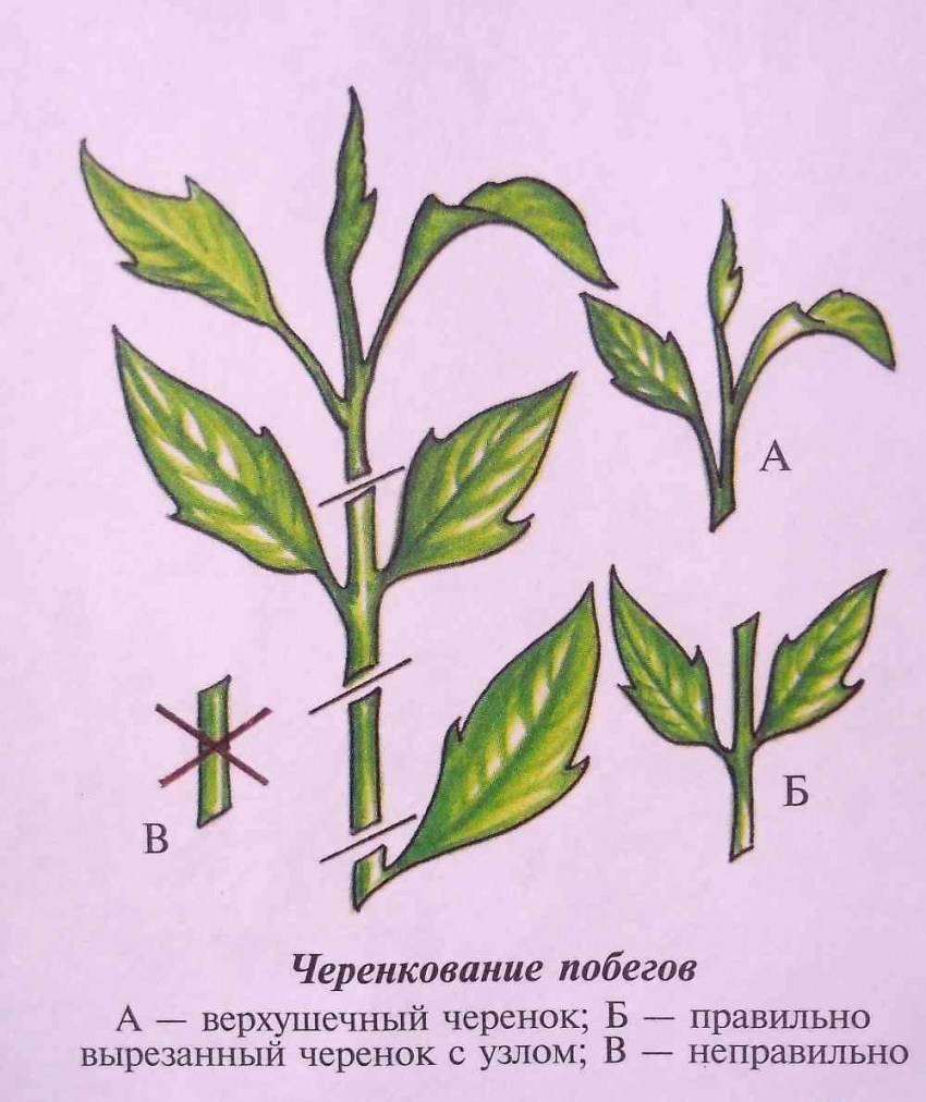 При черенковании на верхушке черенка оставить листочки. Перед посадкой черенки опускают на сутки в раствор с любым корневым стимулятором роста. Затем для укоренения высаживают в готовый специальный субстрат. Обеспечить циркуляцию теплого воздуха снизу – обычно поднимают контейнеры с черенками на опоры или на скамейку.