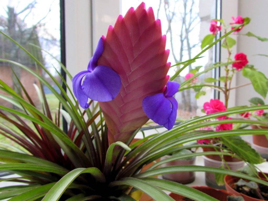- Тилландсия синяя (Tillandsia cyanea). У растения листовые пластины схожи со злаковыми. У основания имеющие красновато-коричневый окрас, а по всей длине они в бурую полоску на зеленом фоне. Вся поверхность укрыта мелкой чешуйчатостью. С приходом лета появляется колосовидное плоское соцветие. Прицветники окрашены в розоватые или фиолетовые оттенки, и вдоль их краев появляются синие или фиолетовые или голубого окраса цветки. Они очень быстро вянут. Цветочные ромбовидные лепестки имеют легкий отгиб. Обычно распускается 1–2 цветка. Высота всего растение не больше 25 см.
