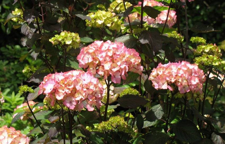 Это двухметровый кустарник, который в ширину вырастает до полутора метра. Отличается этот сорт длительным цветением. Цветочки меняют цвет от голубого до розового. Их окрас обусловлен кислотностью почвы. Куст растет очень медленно. Период цветения: с июня по сентябрь.