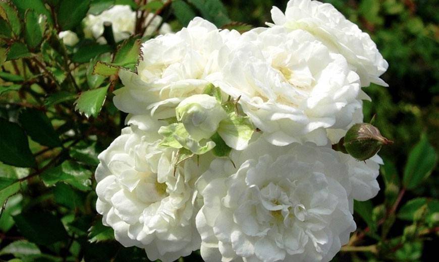 Роза с крупными белыми цветками, морозоустойчивая, неприхотливая.