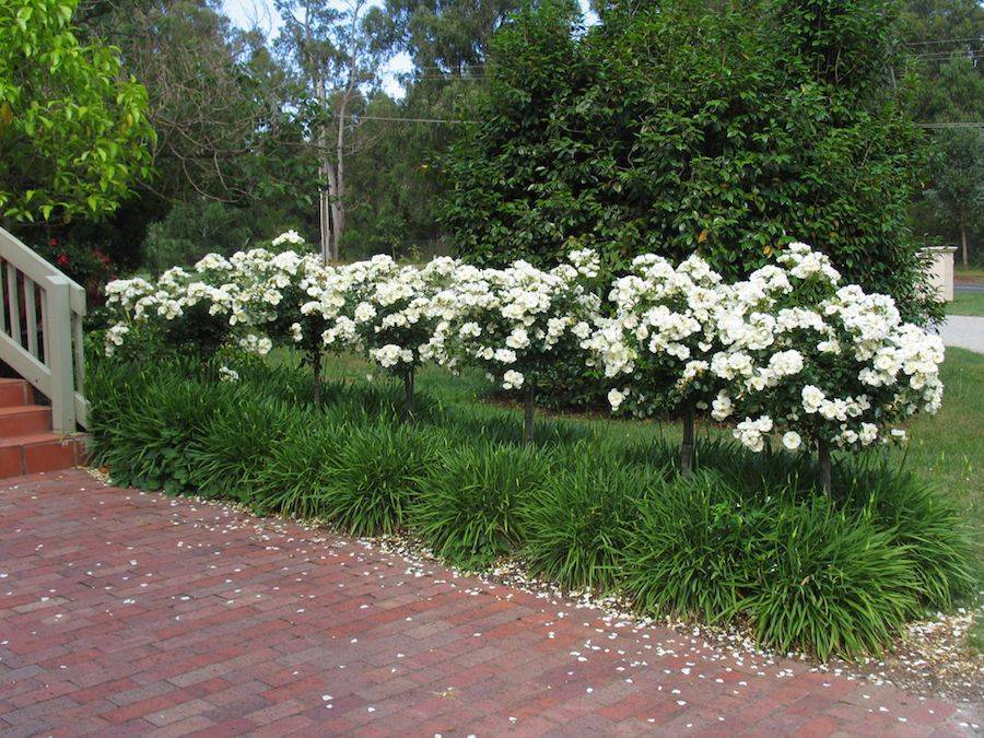 Почвопокровные розы с длинными побегами (более одного метра) прекрасно подходят для прививки на штамб. В этом случае получается невероятной красоты деревца с ниспадающими ветвями, которые во время цветения почти полностью покрыты розочками.