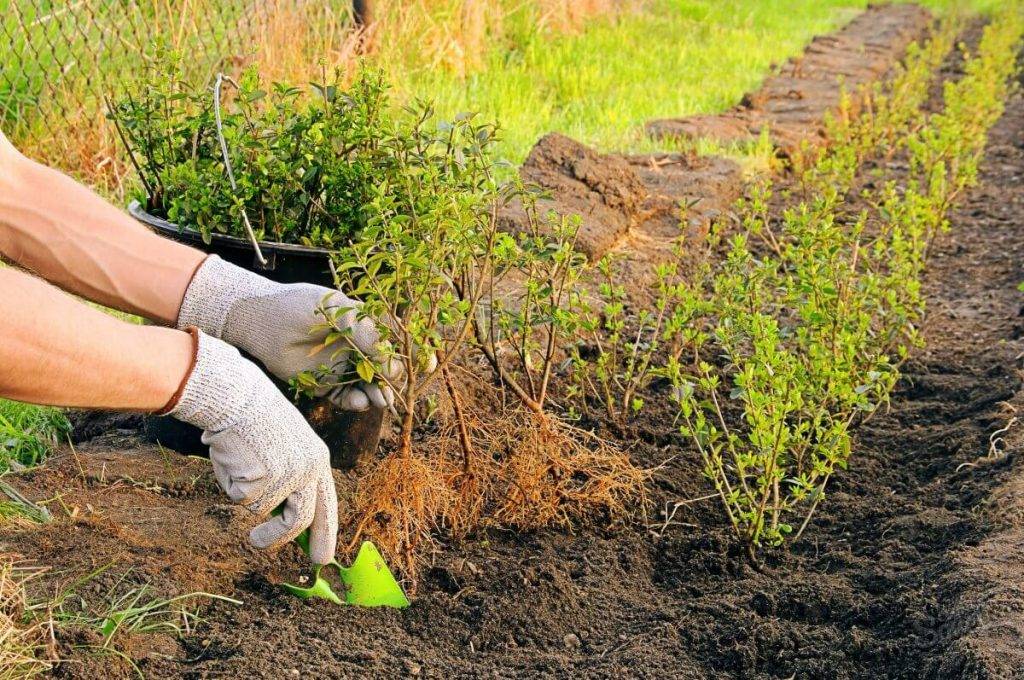 Корень помещают в лунке, присыпают почвой, смешанной с песком и перегноем в равных частях, притаптывают. После под куст выливают ведро воды. Если почва кислая ее необходимо удобрить гашеной известью (300 г) или древесной золой (200 г). Саженцы размещают на расстоянии полуметра друг от друга.