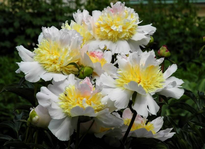 Окрас цветов своеобразен. В середине лепестки желтоватые, а те что их окружают белые или розоватые. Пышность цветения зависит от возраста куста. Обычно наибольшие бутоны вырастают на пионах от пяти лет. Растения, выращиваемые в грунте менее 2-х лет, не цветут.
