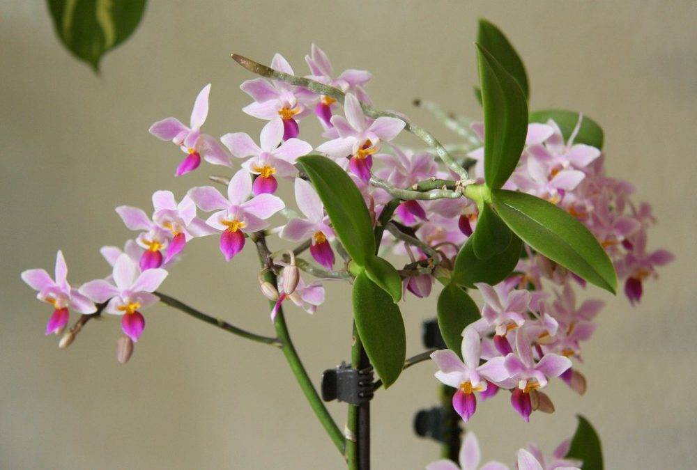 | Фаленопсис Шиллера (Phalaenopsis schilleriana) | до 50 см | темно-зеленые с серебристыми пятнами, нижняя часть листа ― красноватая | до 170 шт., растут каскадом, небольшие пудрово- или бело-розовые |