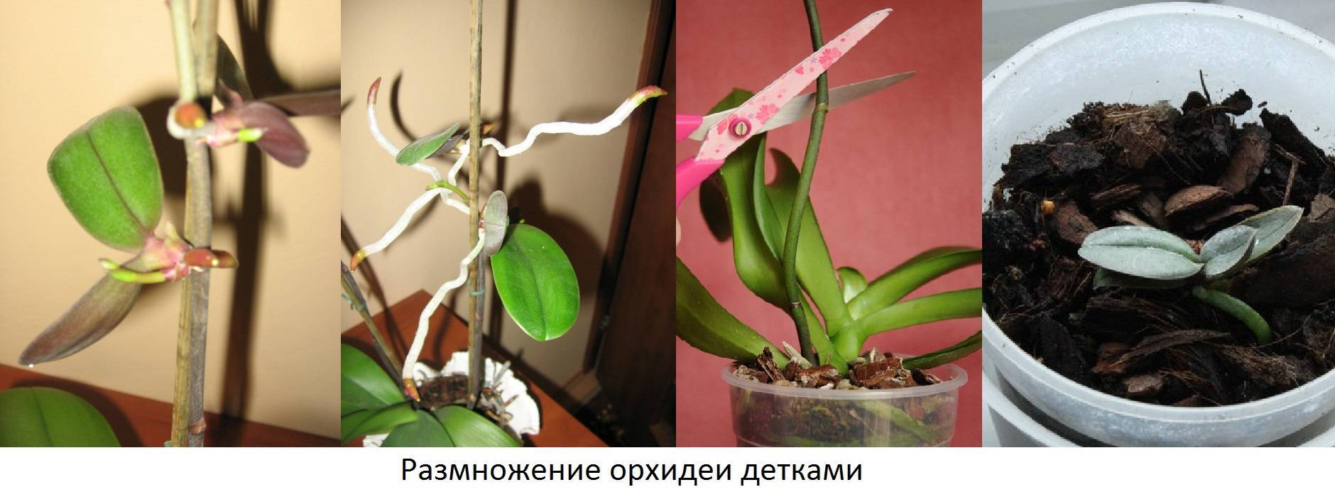- Черенками размножают сорта Эпидендриум, Ванда. Боковые побеги длиной до 150 мм обрезают острым ножом. Срез присыпают толченым углем. Черенок высаживают в горшок, размещая срезом вниз. Уход обычный, как за взрослым растением.