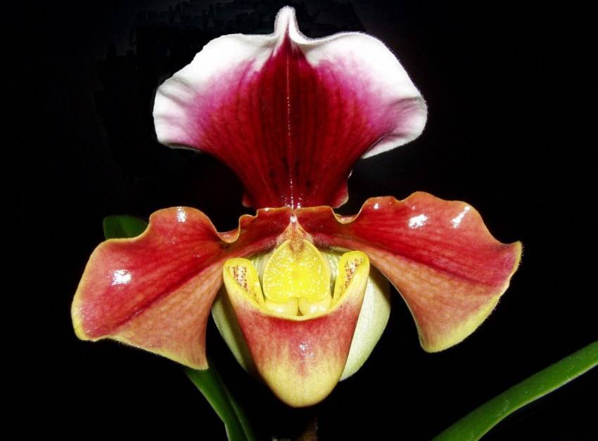 Пафиопедилум Гарриса – садовый гибрид с продолговатыми светло-зелеными листьями. Верхний чашелистик насыщенно красный, к верхушке переходящий в зеленый, по краям белоснежный, с темными прожилками. Лепестки темно-пурпурные, со средних размеров жилкой. В верхней части они коричневые, с темными прожилками, а в нижней – желтоватые, с зелеными жилками. Губа светло-пурпурная, с темными жилами. Стаминодий темно-коричневый.