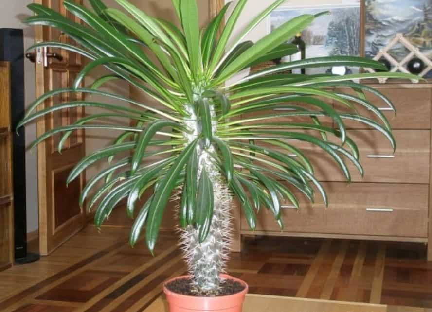 Вот именно этот вид именуют часто «мадагаскарской пальмой». Растение обладает очень пышной кроной за счет большого количества длинных листьев(до 0,4 м). Стволовая часть толстая, с многочисленными бугорками. По стволу располагается много толстых иголок-колючек.