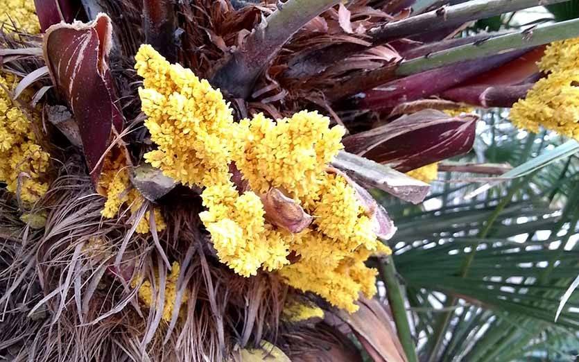 - Цветки мелкие, желто-оранжевые, одно- или обоеполые, образуют гроздевидные соцветия. Зацветает хамеропс в мае-июне.