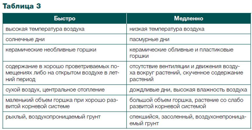 Ориентироваться на тургор вегетативной массы растения новичкам для определения «не пора ли поливать?» не нужно, поскольку увядание или пожелтение листьев может быть симптомом как пересыхания, так и переувлажнения земляного кома. (Таблица 3)