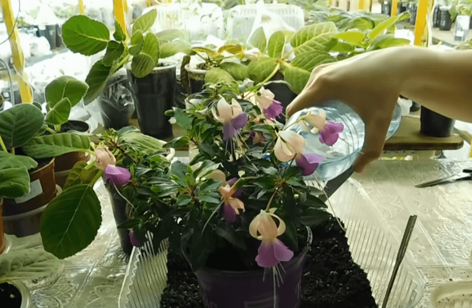 Когда фуксия активно цветёт, её нельзя трогать с места. Полив должен быть таким, чтобы вода не застаивалась и верхний слой грунта не пересыхал.