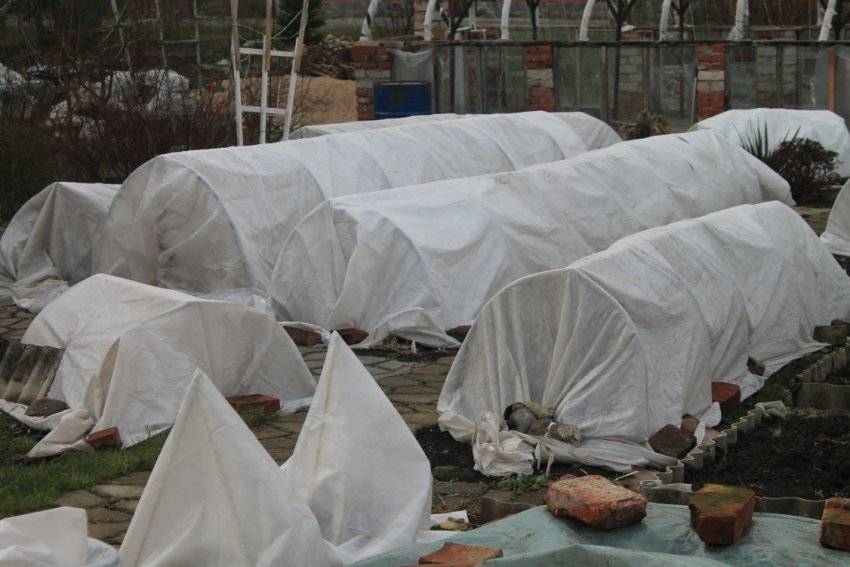 Прикорневое кольцо цветка окучивают, а само растение укрывают слоем из опилок, сосновых иголок, шелухи или прочих натуральных материалов. Сверху такой настил укрывают спанбондом в 2–3 слоя. Высокие кусты на почву не укладывают, вместо этого растение плотно обматывают спанбондом.