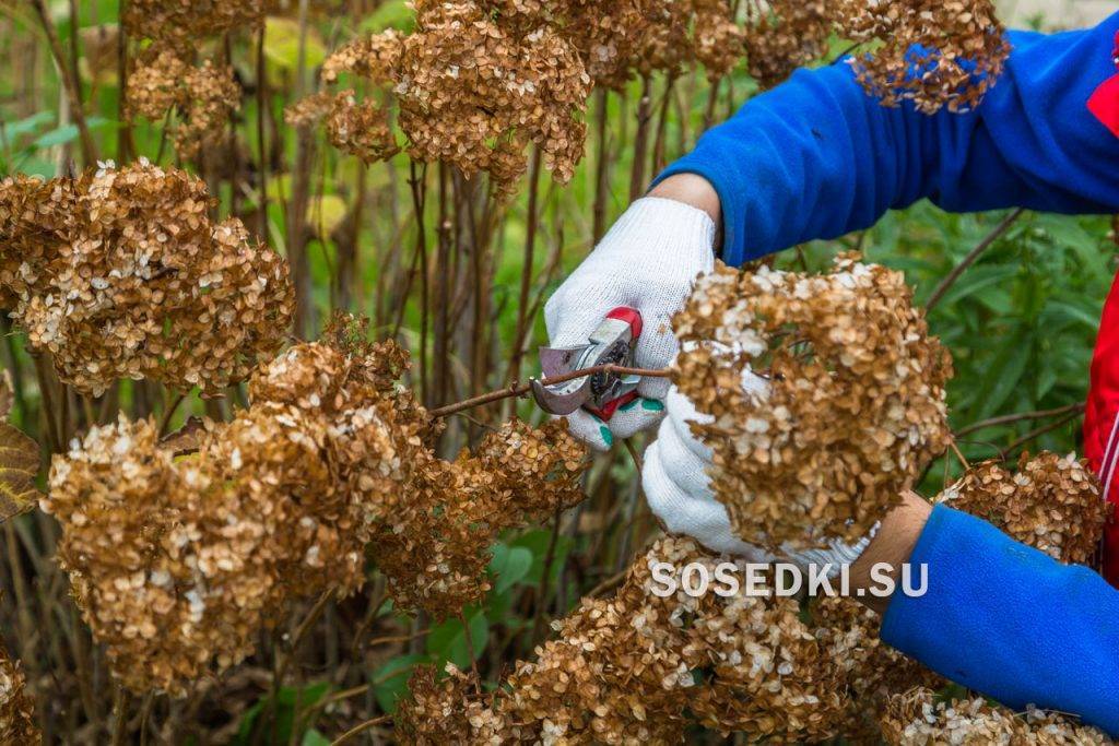 Чтобы сохранить аккуратный вид больших взрослых гортензий, отцветшие соцветия можно убирать по мере подсыхания в течение лета или уже осенью. Старые гортензии омолаживают, полностью срезая их под корень. Обрезкой можно целенаправленно сформировать за 4-5 года маленькое декоративное деревце.
