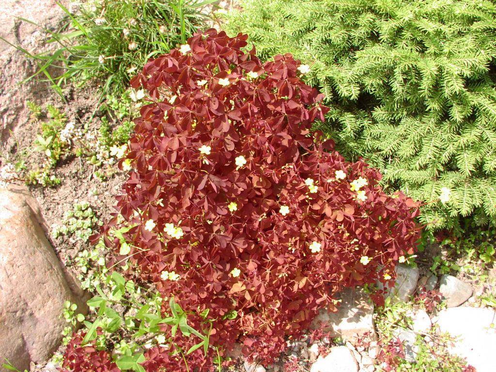 Красноватые листочки рожковой кислицы — одна из особенностей сорта
