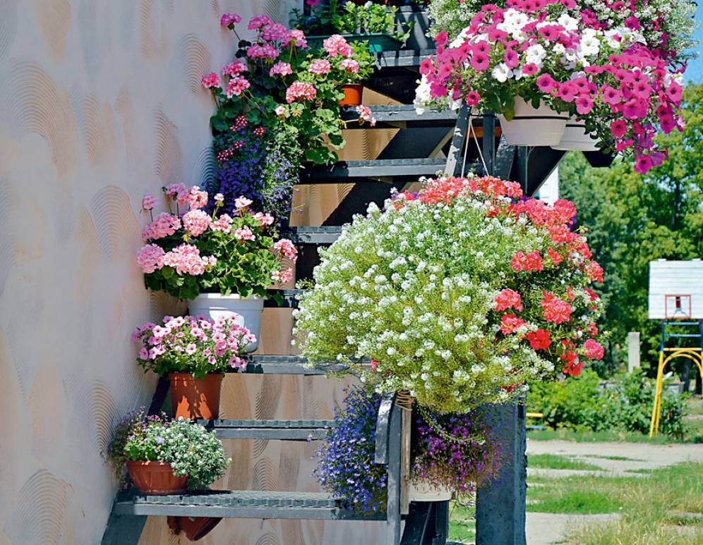 Яркие летники в различных емкостях – отличное украшение сада