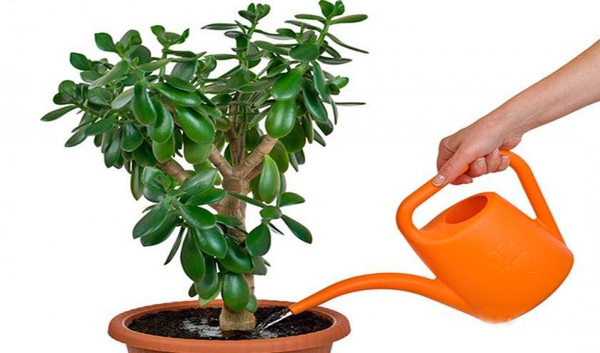 Денежное дерево является суккулентом, поэтому плохо переносит переувлажнение. Полив осуществляется примерно через 3–4 дня после того, как верхний слой почвы хорошо подсохнет. Чтобы избежать застоя воды, для посадки берут горшки с отверстиями для слива. При организации периода покоя для растения интенсивность полива снижают, а затем в холодное время прекращают полностью.