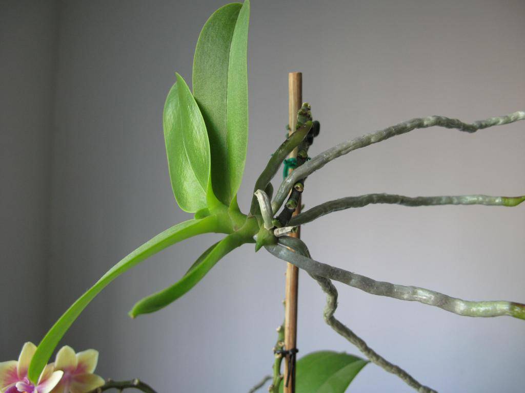 Детка на стволе матери не отпускает собственных корней, она питаются за счет взрослой орхидеи и её общего ствола. Такое потомство ни в коем случае нельзя отделять от орхидеи-матери.