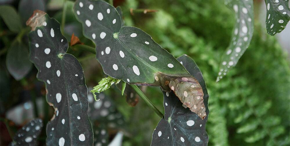 Коричневые или черные пятна на листьях бегонии говорят о солнечном ожоге растения. Переставьте горшок подальше от окна, либо слегка притените его.
