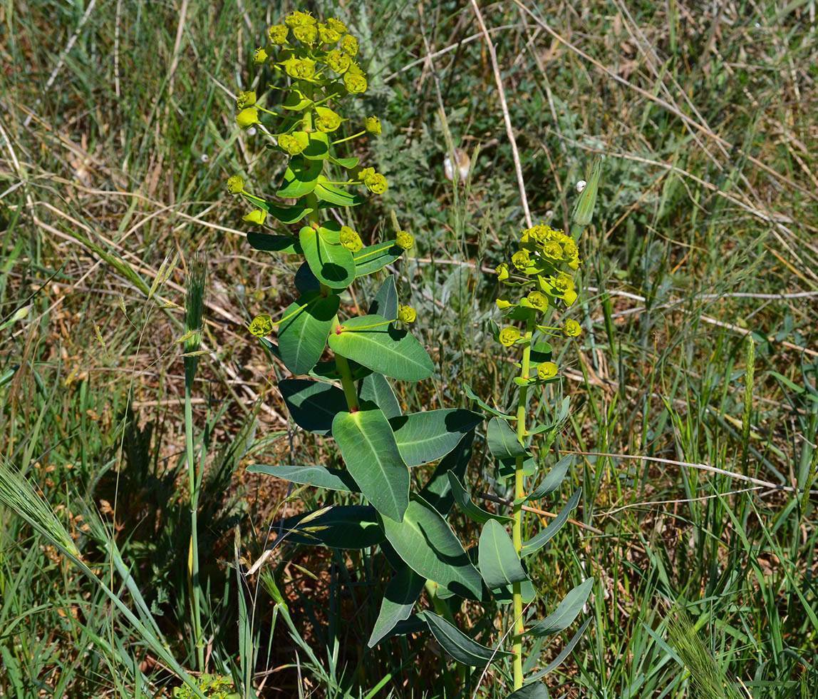Этот вид еще называют молочай пашенный. Травянистое растение от 25 см до 90 см в высоту сизоватого цвета. На многочисленных прямостоячих стеблях расположена густая листва. Цветоносы появляются на верхней части растения. Цветет с конца мая до сентября.