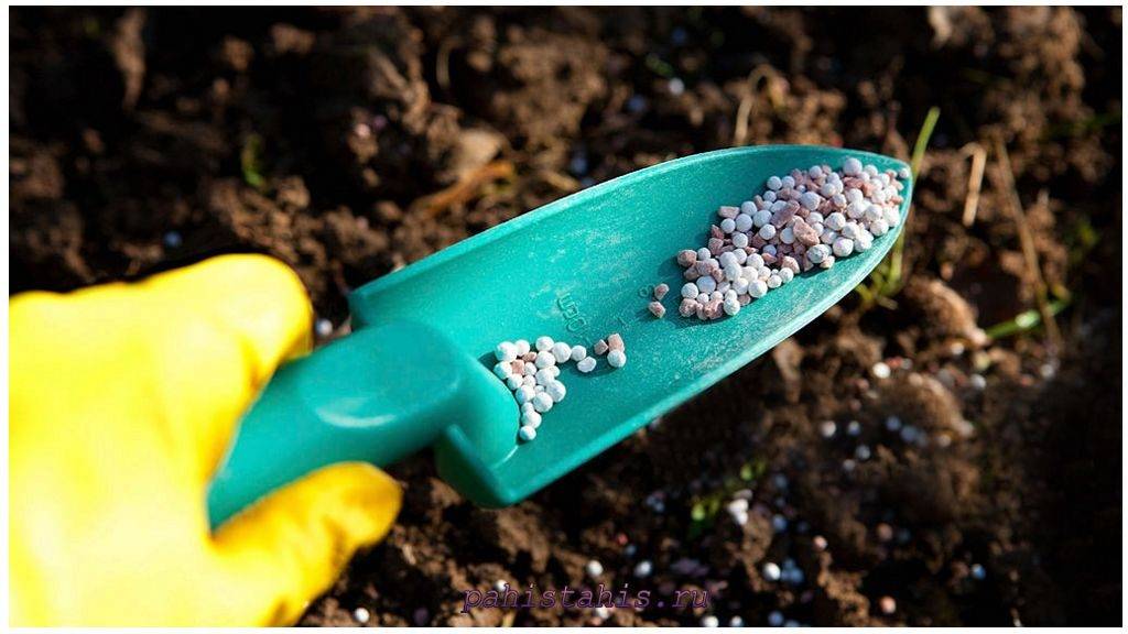 Ранней весной: до появления листьев вносят удобрения с большим количеством азота. Необходимо получить развитую листовую массу. Поэтому выбирают составы с пропорциями NPK – 20:10:10. Из популярных удобрений подходит азофоска. Следует помнить, что при использовании минеральных составов существует риск чрезмерной подкормки. По отзывам садовников, лучше под крупные хосты вносить горсть удобрений на одно растение, под мелкие – соответственно меньше, миниатюрным кустикам хватит маленькой ложечки.