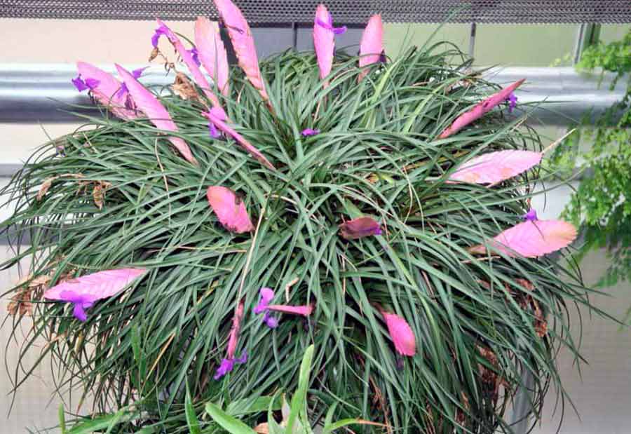 - Тилландсия синяя (Tillandsia cyanea). У растения листовые пластины схожи со злаковыми. У основания имеющие красновато-коричневый окрас, а по всей длине они в бурую полоску на зеленом фоне. Вся поверхность укрыта мелкой чешуйчатостью. С приходом лета появляется колосовидное плоское соцветие. Прицветники окрашены в розоватые или фиолетовые оттенки, и вдоль их краев появляются синие или фиолетовые или голубого окраса цветки. Они очень быстро вянут. Цветочные ромбовидные лепестки имеют легкий отгиб. Обычно распускается 1–2 цветка. Высота всего растение не больше 25 см.