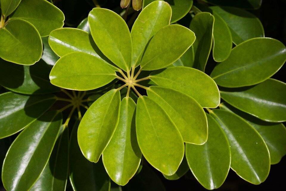 Листья шеффлеры пальчатой тонкие и мягкие на ощупь. Они разделены на 3-9 частей, каждая из которых имеет овальную форму с зазубренными краями. Растение неприхотливо и подходит для выращивания в домашних условиях.