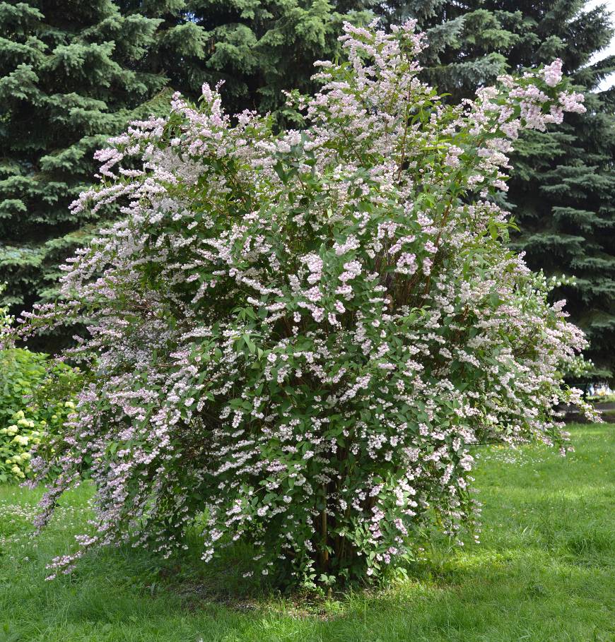Это невысокий, около 1,5 м, листопадный кустарник из семейства Гортензиевые. Характерная особенность дейции, свойственная многим гортензиевым — отслаивание коры. Если приглядеться, то под белым кружевом цветов видны серо-коричневые побеги с тонкими пластинами коры, свисающей «лохмотьями». Это нормальное свойство зрелых побегов, а не следы болезни или вредителя.
