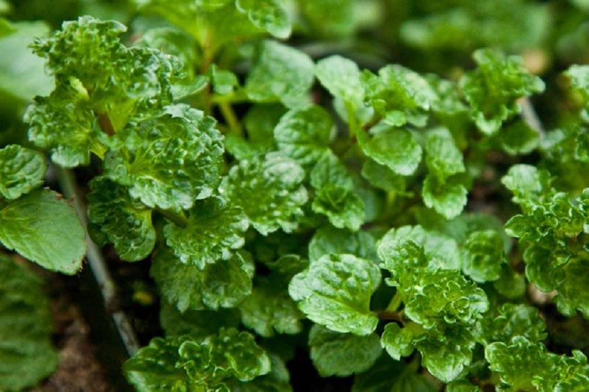 Ботаническое название – мята колосистая (кудрявая). Листья имеют форму удлиненного овала, округлого к краю. Листовые пластины сильно гофрированные, мохнатые, с резными краями. Мелкие бледно-розовые цветочки собираются на верхушке основного стебля, соцветия похожи на колоски.