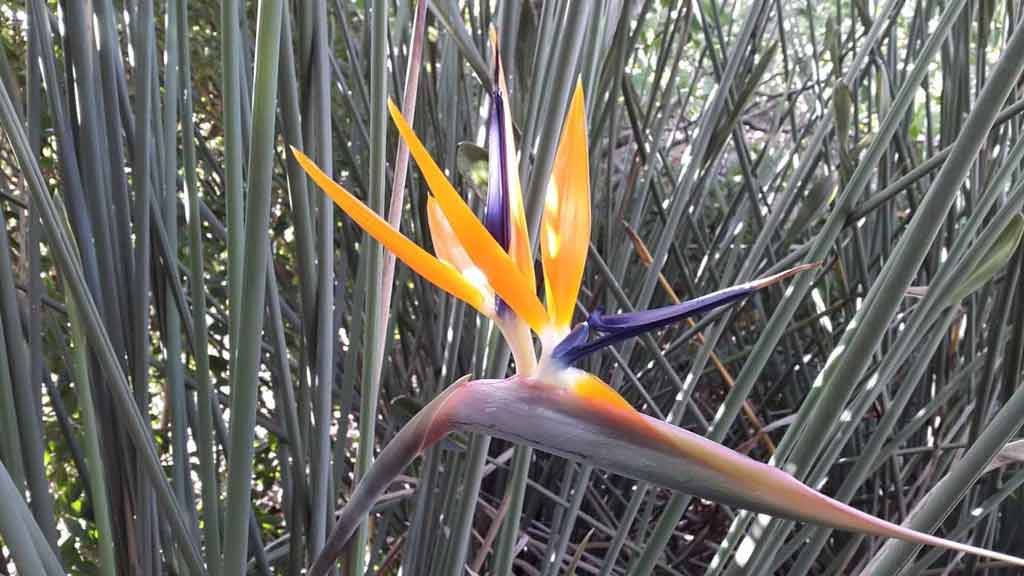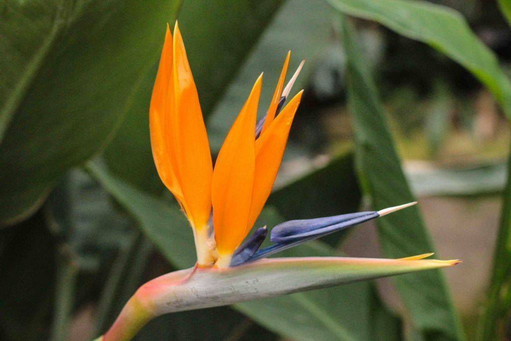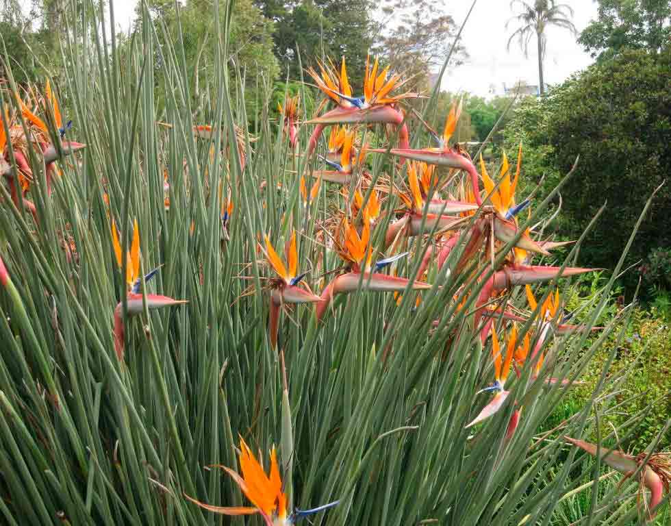 Стрелитция королевская (мелколистная). Живой символ Лос-Анджелеса. Украшающее улицы города Ангелов растение в высоту достигает максимум полтора метра. Листья размещаются в два ряда, их форма овальная, немного сужается. Длина листа – 40 см, ширина –30 см, жесткий черешок чуть более полуметра. На ощупь листы гладкие, с ровными краями. Цветок характеризуется равным количеством лепестков: три вертикально направленных оранжевых и три видоизмененных ярко-синих. Этот вид отлично размножается делением мощного корневища. Для культуры экзот разводят на продажу в Австралии и Африке.