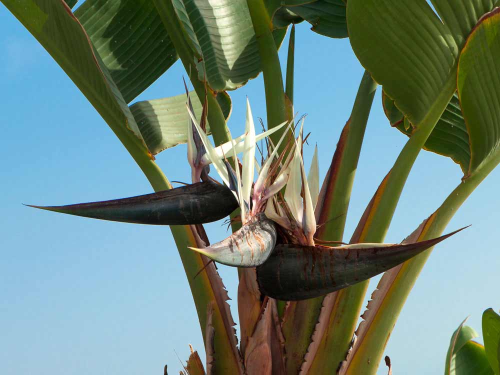 - Стрелитция Горная. «Банан пустыни» (так ее называют на родине) также нельзя назвать мелким комнатным цветком – этот древесный вид вырастает до 9 метров в высоту, а цветы у него бело-красные.