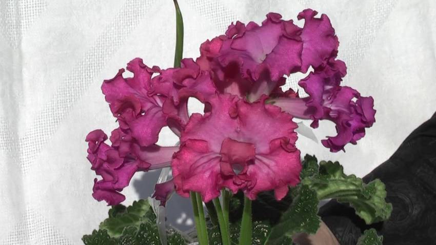 Вечность – невероятно красивый сорт стрептокарпуса. Розеточное растение имеет аккуратную подушку из листьев, над которой образуются цветки. Бутон с густомахровыми лепестками отгиба. Они настолько пышные, что не видно зев венчика. Лепестки имеют плавный переход от цвета фуксия до темно-фиолетового канта.