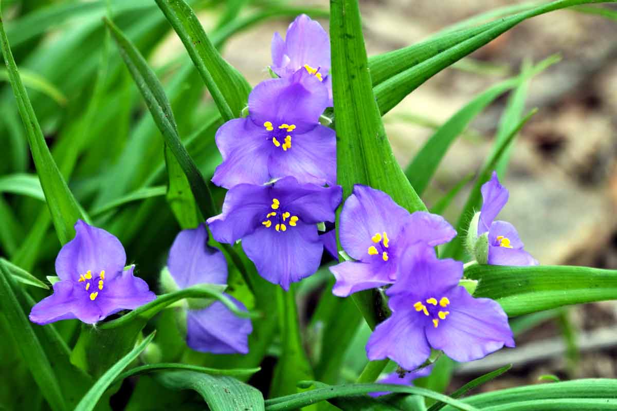 Традесканция виргинская (лат. Tradescantia virginiana). Произрастает в природе на юго-востоке Северной Америки. Стебли растут в высоту до 60 см, с множеством узлов и веток. Листовые пластины имеют форму очень вытянутых ножей и достигают длины 20 см, без черенка плотно охватывают низом листа стебель. Цветы трех лепестковые и окрашены в фиолетовые и розовые тона, достигающие при раскрытии в поперечнике 4 см. Большое их число собрано в соцветие в виде зонтиков и располагаются они на вершине побега, под ним расположены крупные килевидных листки, где и произрастает соцветие. Цветение происходит в жаркие летние месяцы и может длиться до 70 дней. Используется для грунтовых посадок, как многолетнее растение.
