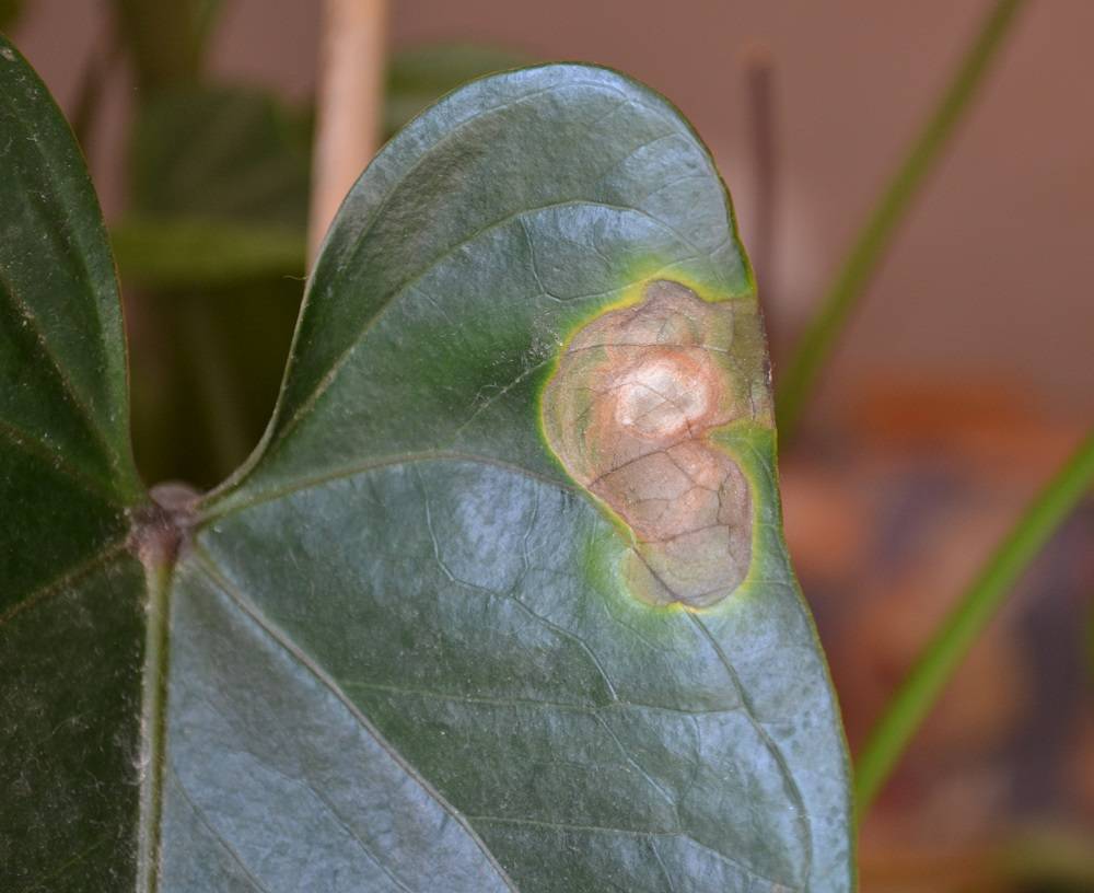 Возбудителями являются грибы из нескольких родов (Colletotrichum, Gloeosporium или Kabatiella), поэтому, пораженное растение может выглядеть по-разному. В большинстве случаев у антуриума, антракноз распространяется от центральной жилки к краям. Лист сохнет, скручивается, истончается и становится ломким и сухим.