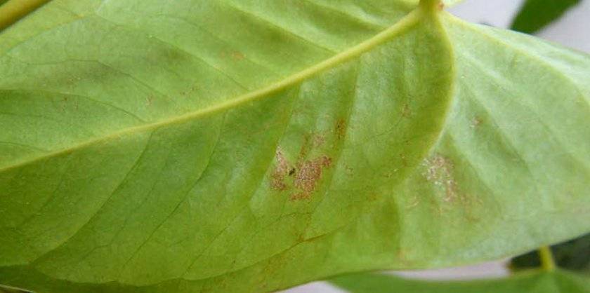 Ржавчина – грибковое заболевание антуриума, при котором листья покрываются светлыми пятнами сверху, и красно-коричневыми с изнанки. Со временем на пятнах появляются споры грибка в виде бурого порошка. Чтобы не допустить распространения грибка и гибели цветка, при первых признаках болезни его опрыскивают фунгицидами.