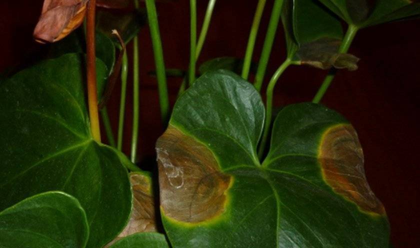 Случается, что листья антуриума желтеют и сохнут не целиком, на них появляются пятна различного цвета, размера и формы. Их внешний вид поможет определить причину, по которой страдает цветок: