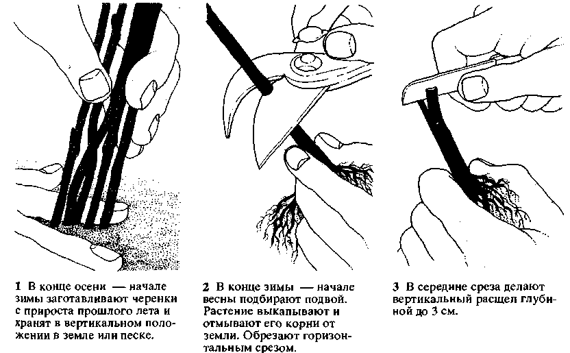 Черенок весной срезают на расстоянии 1 см над развилкой ветвей или почкой. Срез делают под наклоном. Нижняя часть его обрабатывается стимуляторами роста и выдерживается в них минимум одни сутки.