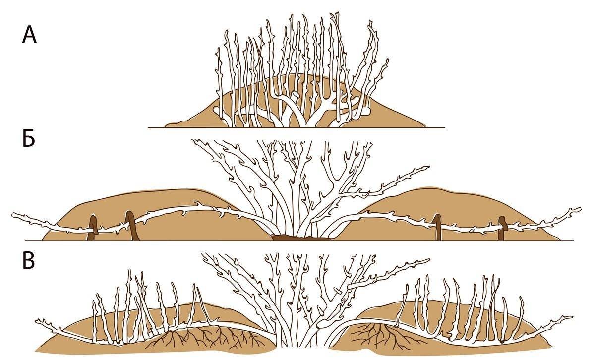 - Нижний стебель наклонить, уложить в траншею и закрепить скобами из проволоки.