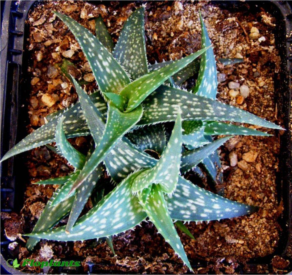 Еще один гибрид Алоэ остистого и неизвестного вида Гастерии. Довольно крепкое растение с толстыми, широкими темно-зелеными листьями с белыми точками. Суккулент прост в уходе.