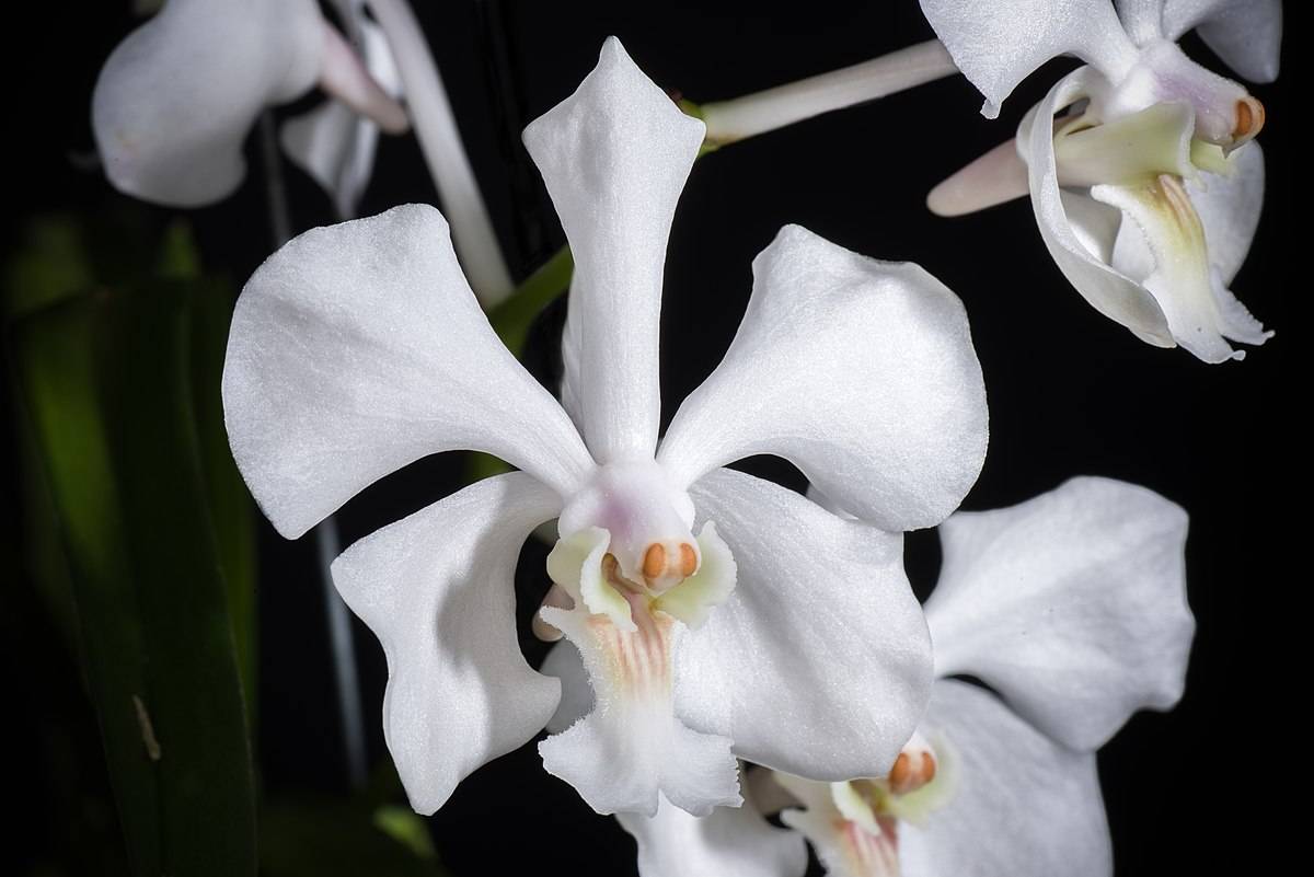 - Vanda suaris. Это ванда суарес (нежная). Она имеет ремневидные листочки, которые расположены в два ряда. Обычно растение радует цветением в весеннее время, а на каждом цветоносе формируется около 10-12 цветочков диаметром 5-7 сантиметров каждый. Цветы преимущественно белые с фиолетовыми вкраплениями и волнистыми краями.