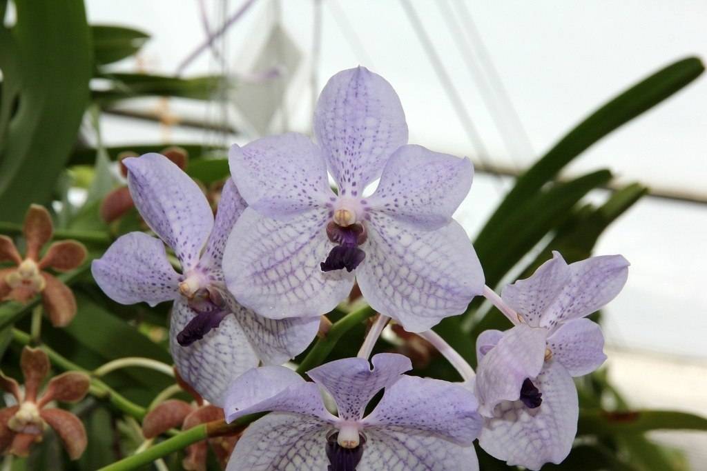 - Vanda rothschildiana. Это гибрид, полученный путем скрещивания голубой и сандеры. Соответственно, сохраняются родительские особенности. Сами цветочки небольшие – до пяти сантиметров в диаметре, зато в одном соцветии их может быть до 20 штук. Расцветка может быть различной, но преимущественно она сиреневатая, на лепесточках имеются темные прожилки.