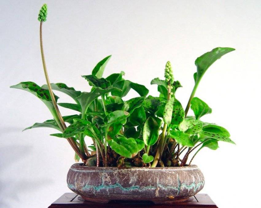 - Дримиопсис Доломитикус. Выделяется на фоне других видов миниатюрностью – небольшие сердцевидные листья с пятнистым окрасом не имеют черешков, располагаются близко к грунту. Во время цветения листочки оборачиваются вокруг цветоносов, на конце которых распускается кисточка светлых цветков. Отделенные друг от друга цветоносы с листочками выглядят необычно и красиво.