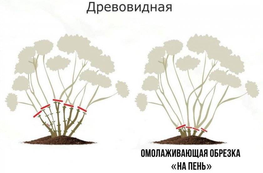 Обрезать древовидные сорта лучше незначительно, достаточно сделать срез на расстоянии двух почек от края. Обязательно срезают повреждённые и больные побеги.