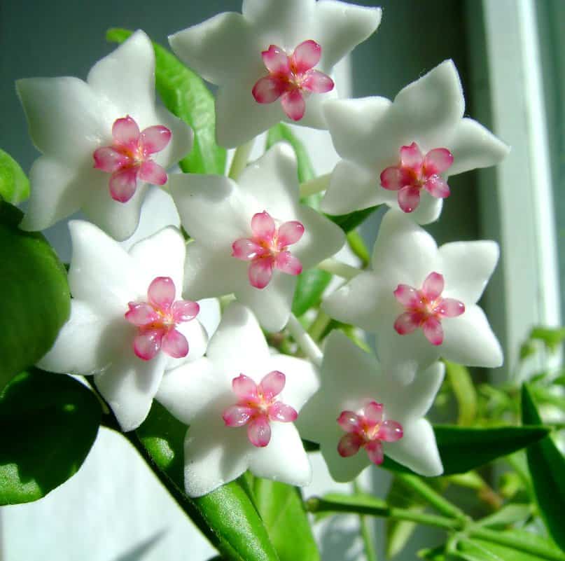 Восковой плющ имеет белые или ярко-розовые цветы в форме звездочек, их диаметр составляет около 15 мм, а количество в соцветии – 15-20 штук.