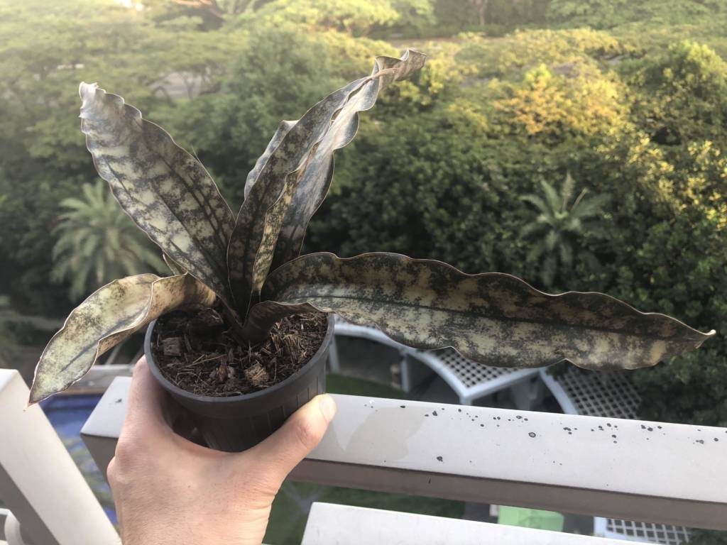 Очень необычный вид, который часто выращивается в виде одного большого овального и жесткого листа, из-за чего растение получило имя «плавник акулы». Листья темно-зеленого или сизого цвета с нечеткими светло-зелеными пятнами, хорошо переносит слабый свет.