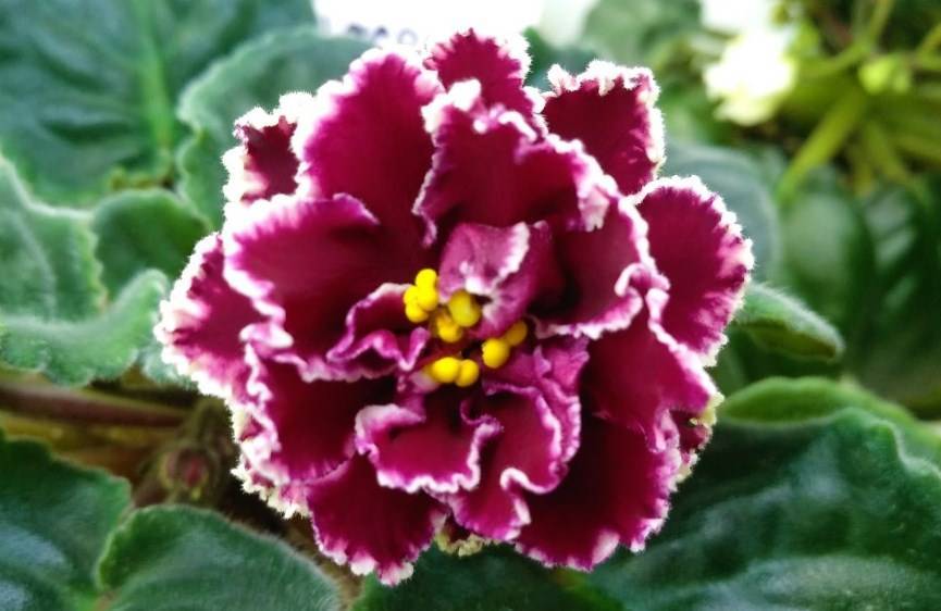 Махровые листья и яркий цветок фиалки, запечатленные на макро-съемке