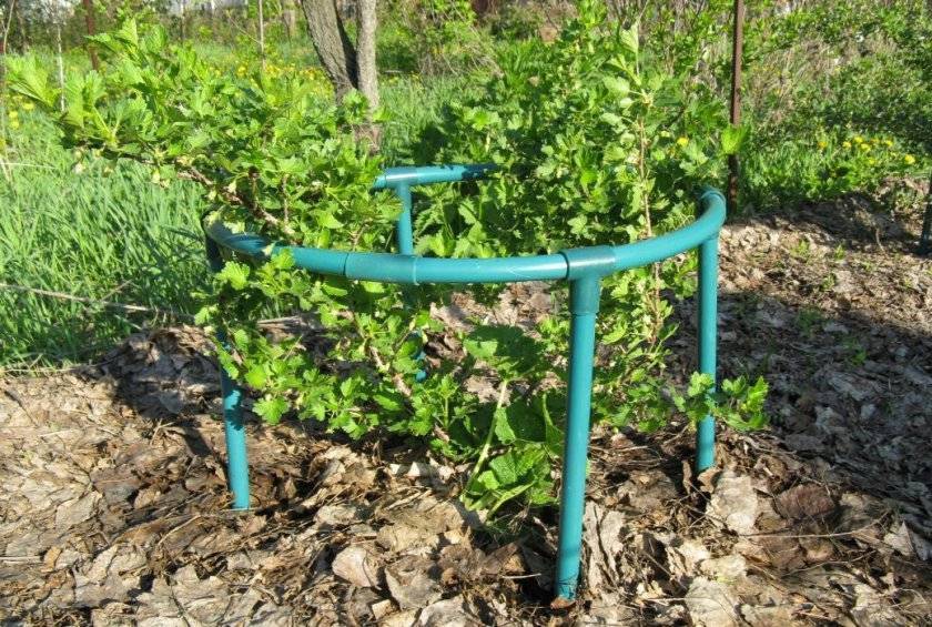 На расстоянии 30–40 см от куста необходимо вкопать в землю трубу или брусок. Высота такой опоры должна быть на 30 см выше кустарника. К ней привязывают нижние и верхние побеги с помощью верёвки или лоскута ткани. По мере роста растения необходимо поднимать крепления, чтобы побеги не ломались и не прислонялись к почве. Иначе плоды будут гнить.