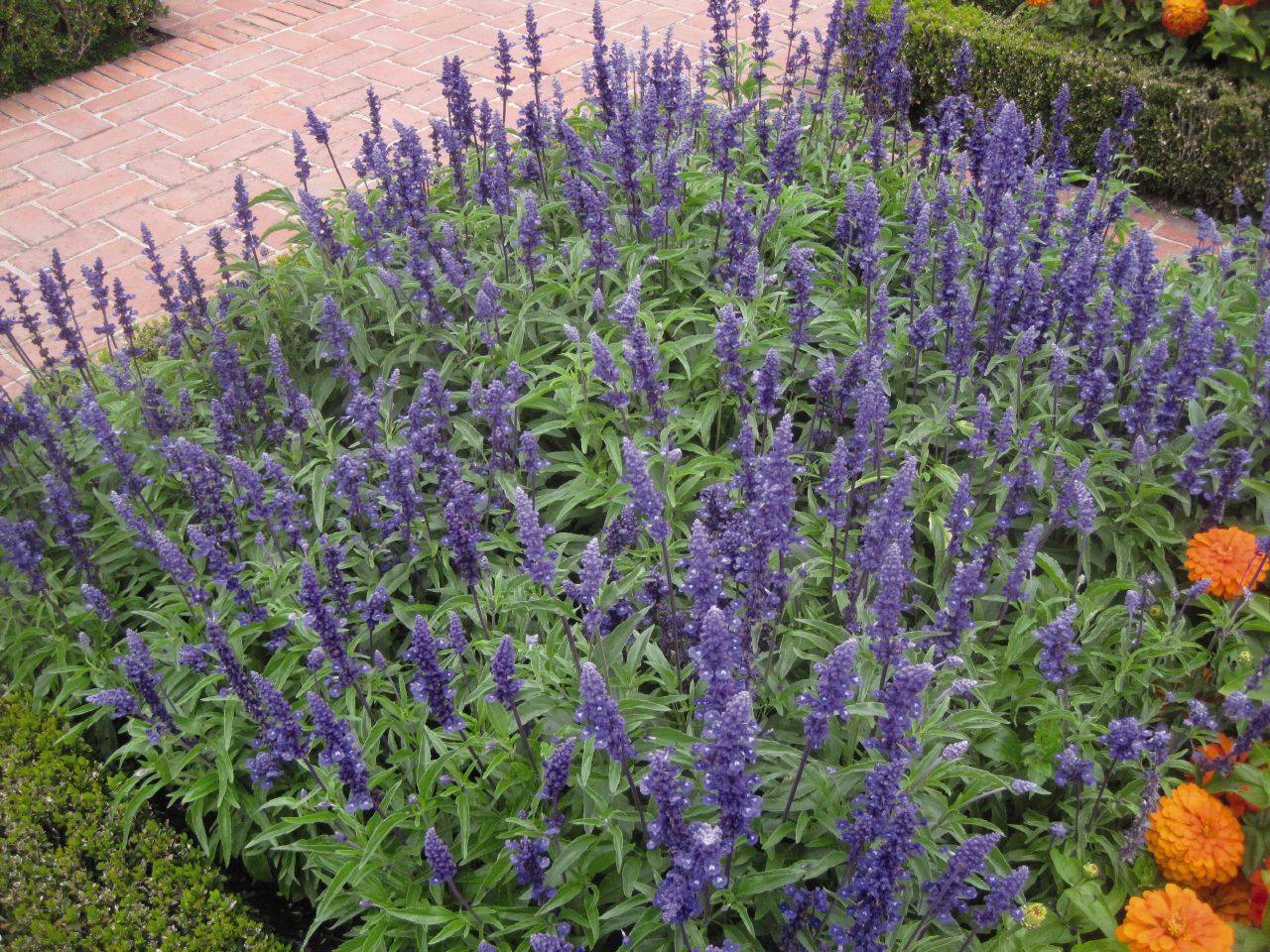 Сальвия мучнистая – это многолетник, который способен долго цвести даже при неблагоприятных условиях. Высота растения – 50-70 см. Внешне напоминает куст пирамидальной формы. Цветет в период с конца августа до середины ноября. Длинные соцветия представлены чаще в синем, а иногда и в белом цвете.