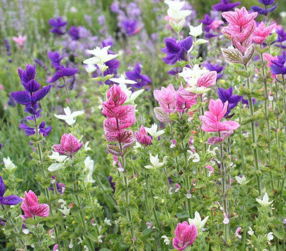 Сальвия Хорминум – декоративная разновидность с цветными подцветниками, мутовчатыми соцветиями различных оттенков. Высота цветка составляет 40-60 см, куст у него раскидистый, хорошо облиственный, густой.
