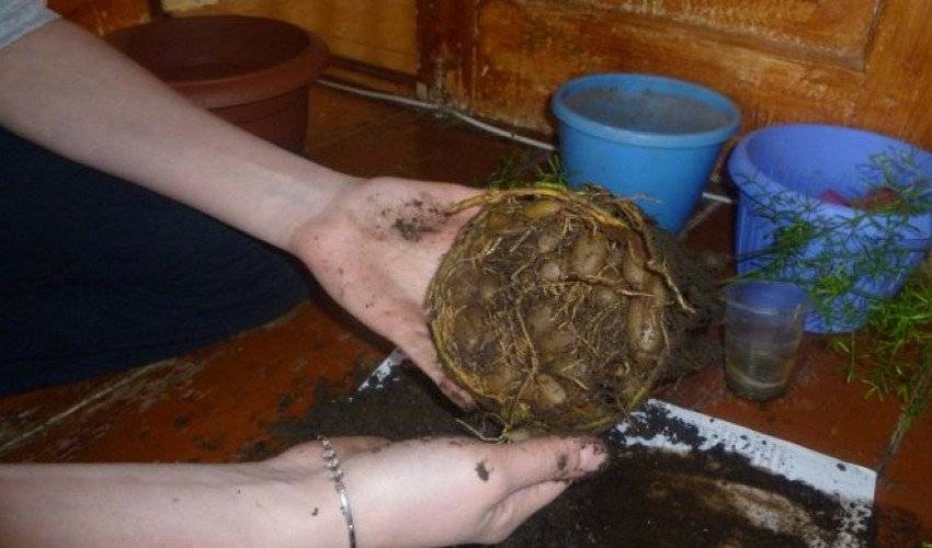 - Вывалив растение из горшка, нужно очистить корневище от налипшей земли.