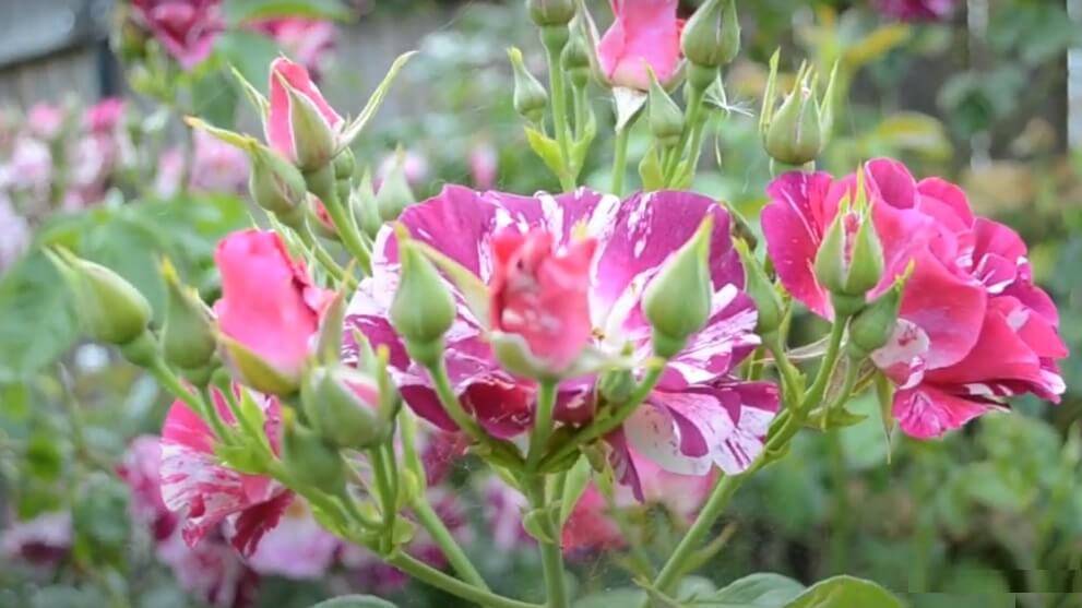 Сразу после посадки роза начинает наращивать мощный корень, а затем начинают расти побеги. Цветы появляются в первый же год. Они похожи на ярких тропических бабочек, которые сели на куст и не спешат улетать. Каждый лепесток хаотически раскрашен полосками насыщенного фиолетового и белого цветов, узоры никогда не повторяются. Цветов на стебле много (10-15), это настоящее соцветие, причем постоянно появляются новые бутоны, так что можно одновременно увидеть полностью распущенные розы, полураскрытые цветы и совсем маленькие зеленые бутончики.