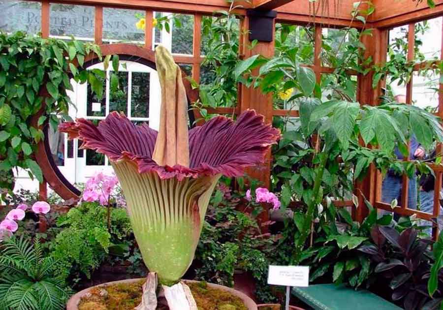- Аморфофаллус Титанический ( titanum) считается самым крупным цветком в мире, у которого не только цветение огромное, но и клубень, который может достигать размерами до полуметра, а весом 23 кг. Открыл этого гиганта травянистого мира ботаник из Италии Одорадо Беккери, который нашел его в тропическом лесу Суматры. В последствии многие ботанические сады мира начали выращивать этот чудо цветок заманивая к себе все больше и больше посетителей желающих поглазеть на соцветие ростом с человека, а то и более 2 метров. Початок этого огромного цветка возвышается над покрывалом практически на 1.5 метра, а во время цветения он нагревается до 40 °C, распространяя зловоние тухлого мяса.